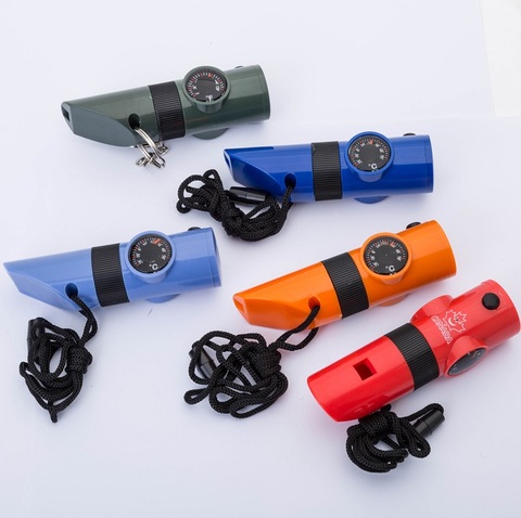 7 in 1 작은 스토리지 다기능 휘슬 나침반 온도계 돋보기 거울 LED 빛